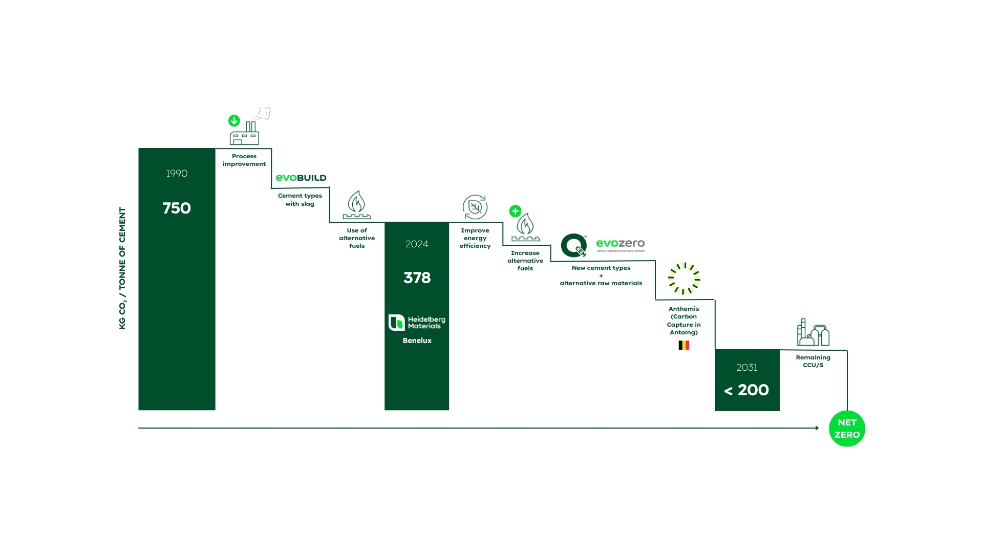 Bij Heidelberg Materials werken we doelgericht toe naar een net-zero proces, waarin we onze ecologische voetafdruk stap voor stap minimaliseren. Deze ambitie vraagt om een integrale aanpak: van het verbeteren van onze producten en processen tot het actief terugdringen en opvangen van CO₂‑emissies. Onze Roadmap to Zero is daarom opgebouwd rond 3 strategische pijlers die elkaar versterken en die samen de basis vormen voor een duurzame cementindustrie.