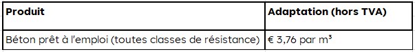 À compter du 1er avril 2026, une adaptation tarifaire complémentaire sera appliquée à nos produits. Cette modification s'applique à toutes les livraisons et enlèvements à partir de cette date et s'ajoute aux prix déjà convenus :