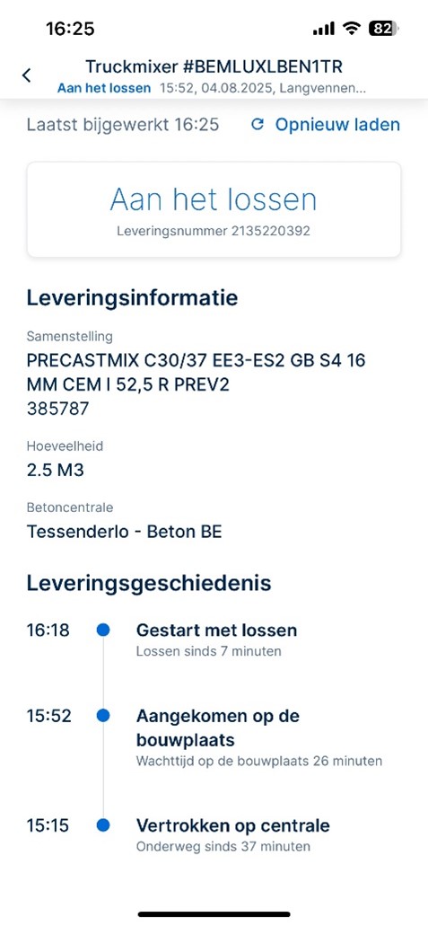 Check op elk moment de status en real time locatie van de mixer die uw beton levert.