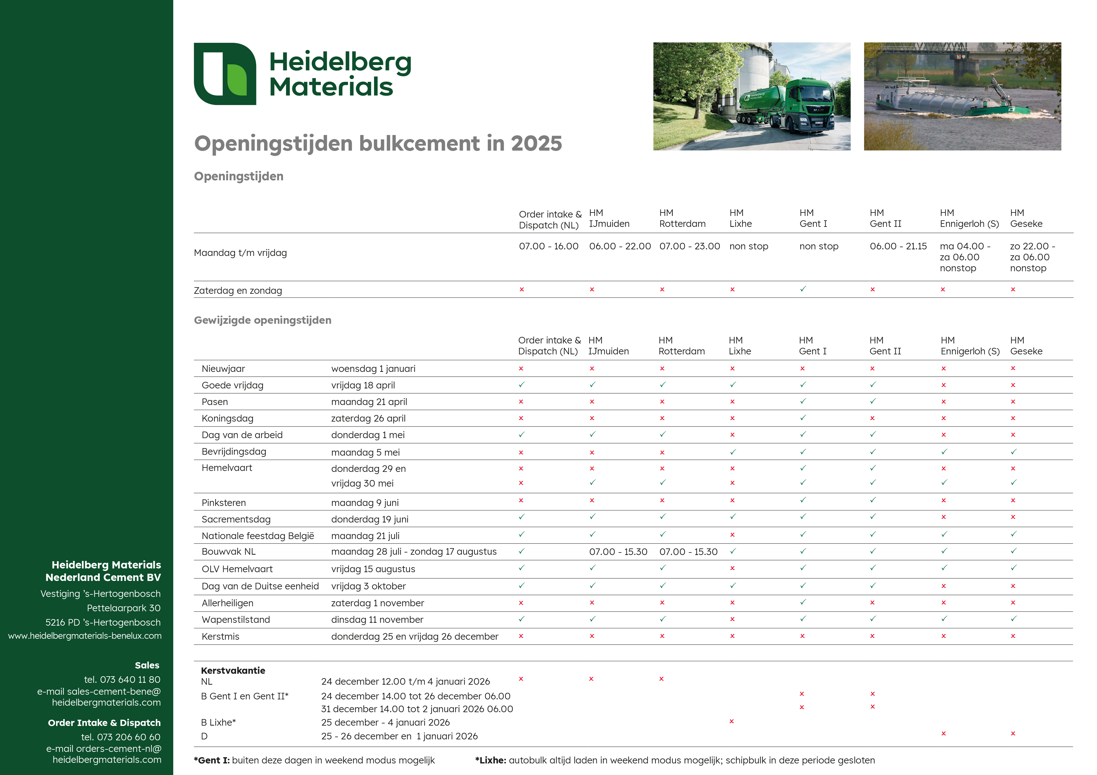 Openingsuren en sluitingsdagen van onze groeven Bekijk onze openingstijden en sluitingstijden door ons document te downloaden: Timetable 2025.xlsx XLSX, 49.11 Ko Voor Cement in Nederland:
