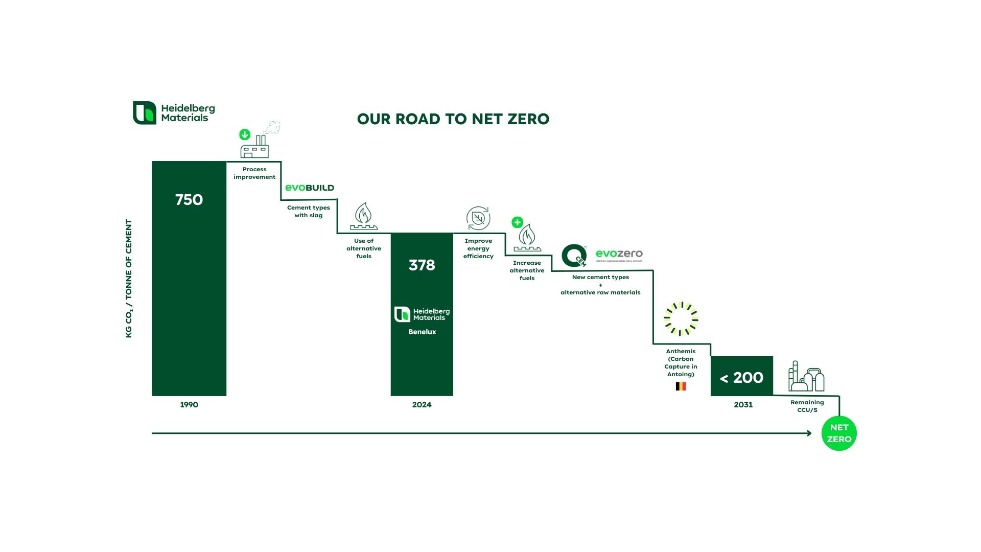 Bij Heidelberg Materials werken we doelgericht toe naar een net-zero proces, waarin we onze ecologische voetafdruk stap voor stap minimaliseren. Deze ambitie vraagt om een integrale aanpak: van het verbeteren van onze producten en processen tot het actief terugdringen en opvangen van CO₂‑emissies. Onze Roadmap to Zero is daarom opgebouwd rond 3 strategische pijlers die elkaar versterken en die samen de basis vormen voor een duurzame cementindustrie.