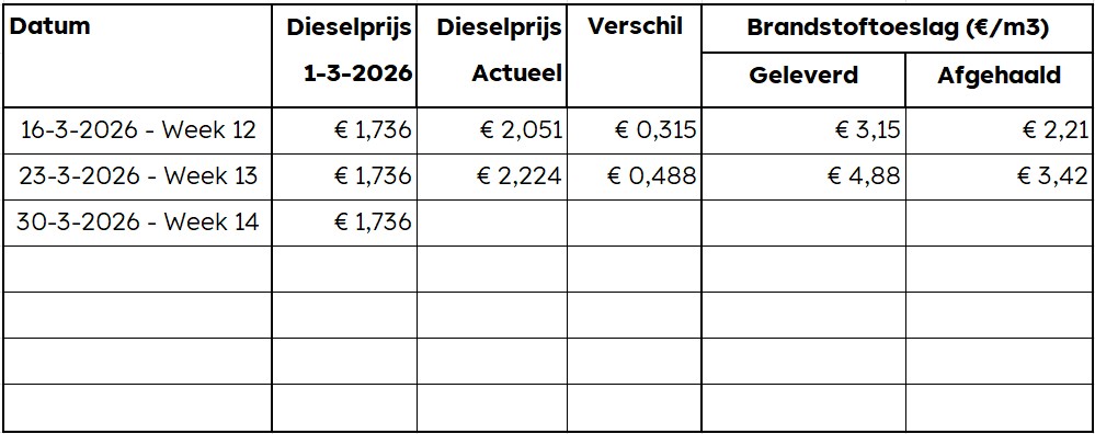 Als basis geldt de dieselprijs op 1-3-2026 van € 1,736/liter. Wanneer de dieselprijs boven dit bedrag uitkomt, verrekenen wij voor elke € 0,01 verhoging per liter, € 0,10/m³ geleverd materiaal. De brandstoftoeslag wordt wekelijks bepaald op de 1e werkdag van de desbetreffende week en is van toepassing op alle leveringen in deze week. Afhaalklanten ontvangen 30% korting op de brandstoftoeslag t.o.v. de franco prijs.