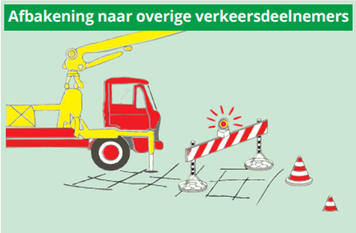 Staat de pomp en/of de betonvrachtwagen op de openbare weg? Dan is een vergunning verplicht! Zorg daarnaast voor voldoende afbakening om een veilige opstelplaats te creëren. Hieronder vind je een voorbeeld: