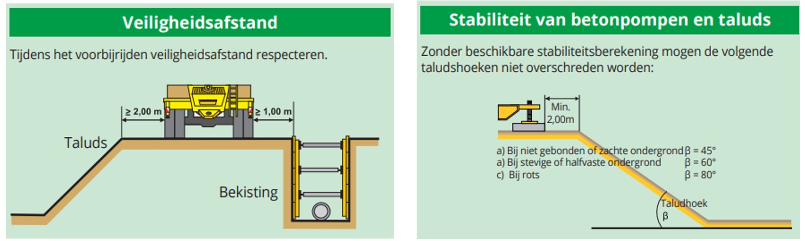 weet dat een pomp géén gewone vrachtwagen is. Het is een voertuig dat wordt gestabiliseerd met steunpoten om de krachten op te vangen die tijdens het verpompen ontstaan. Om veilig te kunnen werken is het belangrijk dat je bij een pomp dezelfde soort maatregelen neemt als bij een kraan. Daarnaast moet de opstelplaats aan een aantal voorwaarden voldoen om het werk veilig uit te voeren.