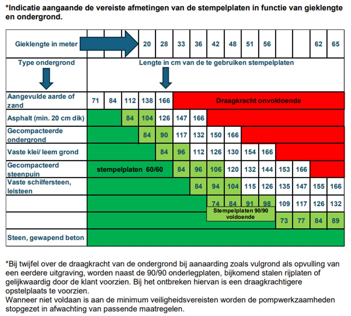 Om de kracht die op de steunpoten komt op te vangen is voldoende draagkracht van de ondergrond noodzakelijk. Bij een grotere pomp zijn de krachten groter en is een stevigere ondergrond noodzakelijk. Bij twijfel, plaats rijplaten!