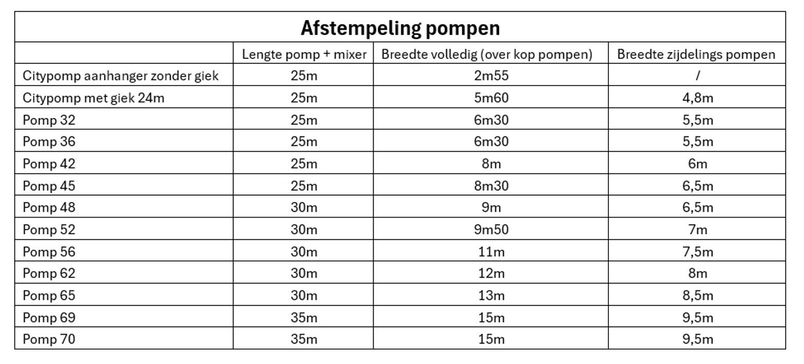 Bij het plaatsen van de pomp is het belangrijk dat je voldoende ruimte hebt voor het uitklappen van de steunpoten en voor de vrachtwagen die het beton komt brengen. De minimaal benodigde ruimte hangt af van de reikwijdte van de pomp. Op onderstaande tabel zie je hoeveel ruimte je moet voorzien: